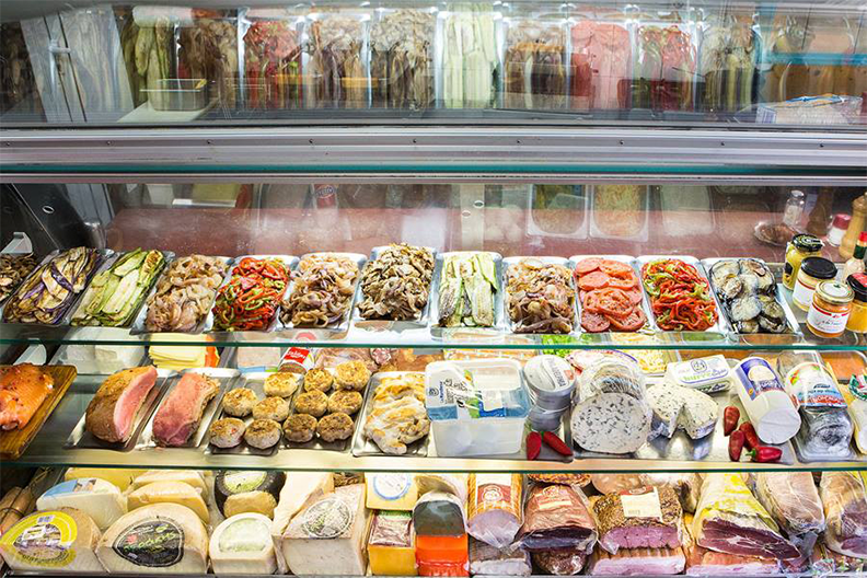 Μπαίνοντας μέσα, στη μία βιτρίνα αντικρίσαμε μια τεράστια ποικιλία αλλαντικών και τυριών, από διάφορα μέρη του κόσμου, ενώ στη δεύτερη βιτρίνα τράβηξαν την προσοχή μας τα πολλά και ολόφρεσκα λαχανικά, έτοιμα να μπουν στις σαλάτες σας!